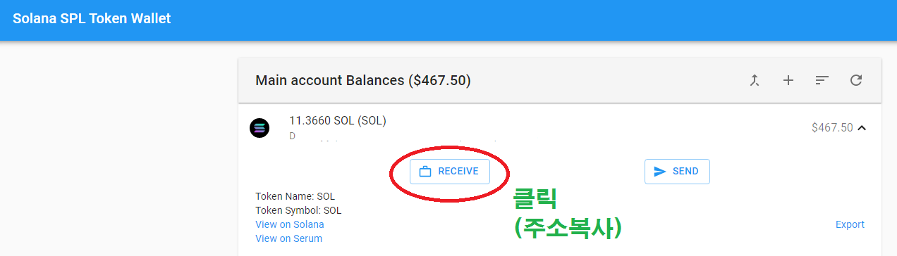 sollet 지갑에서 SOL코인 주소를 복사합니다.