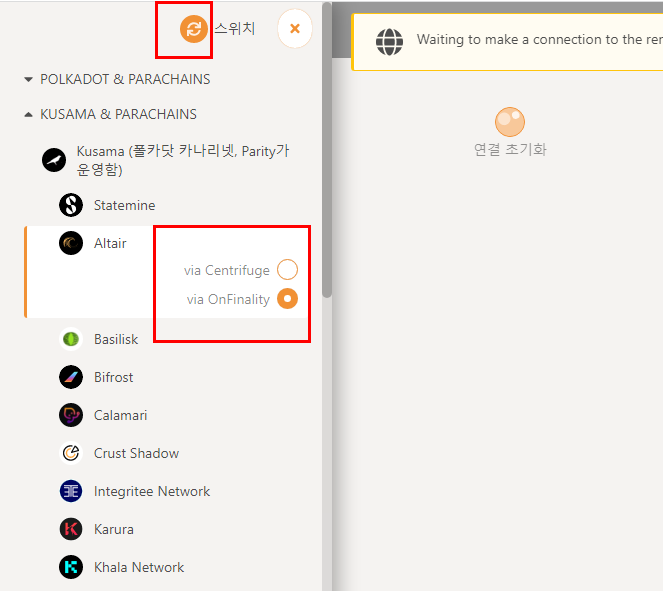 - 참가한 파라체인 선택 및 스위칭 클릭