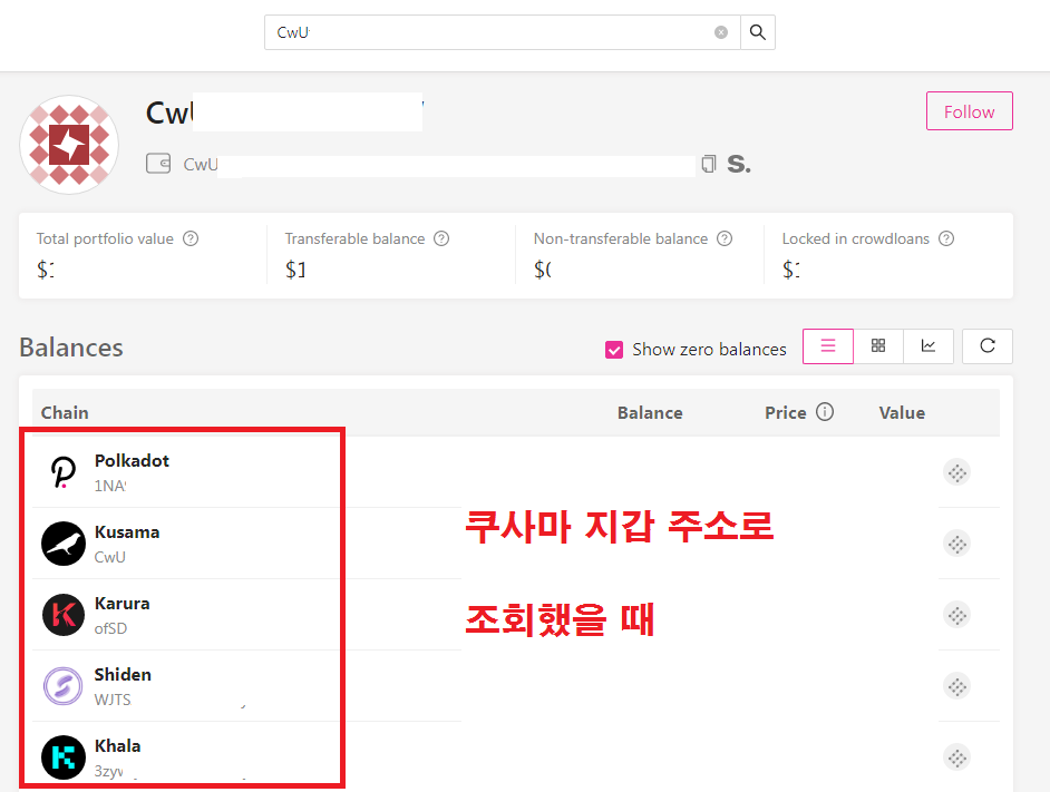 돌아와서 위 주소 검색창에 쿠사마 주소 또는 폴카닷 주소 중 어느 것을 넣어도 같은 조회 결과가 나오는 것을 알 수 있습니다.