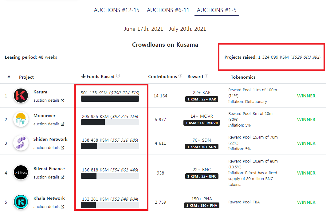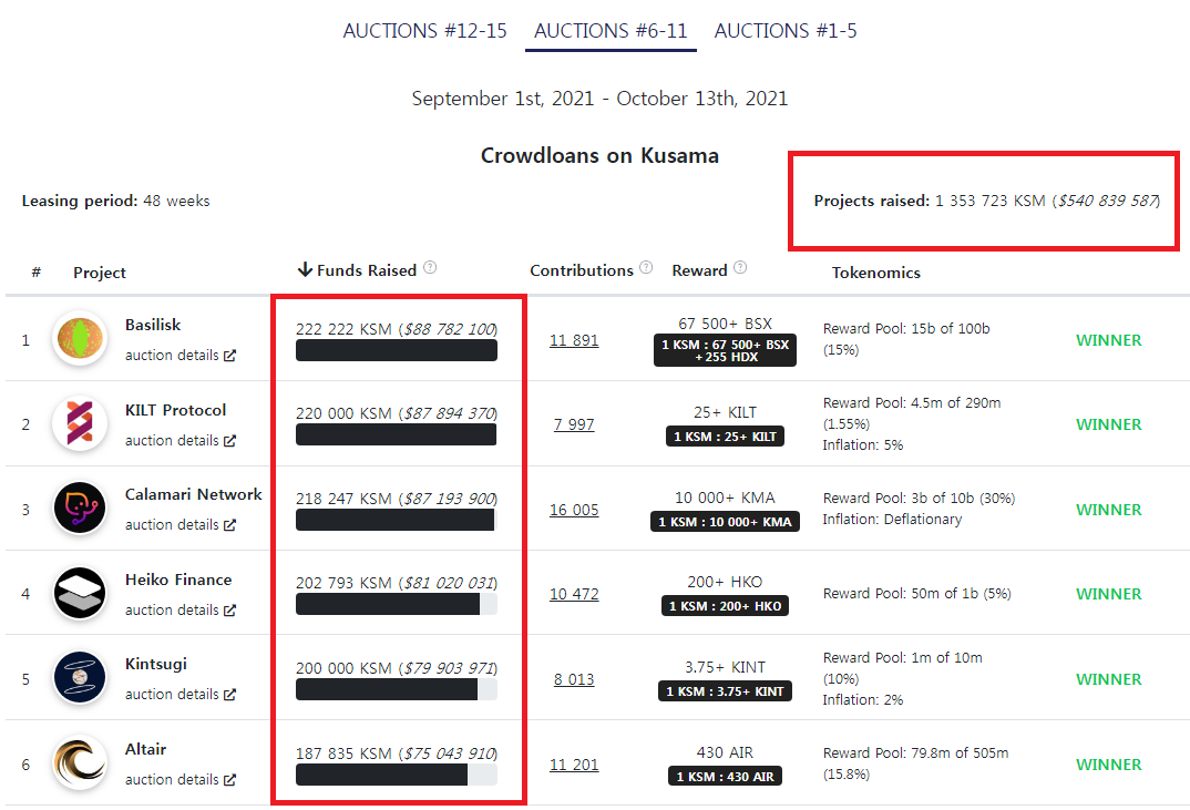 코인겟코에 따르면 현재 쿠사마 코인 총 발행량은 1천만개 입니다. 이 중 올해 두 번의 파라체인 옥션이 있었고, 11개의 슬롯 경매의 당첨이 이뤄졌습니다.