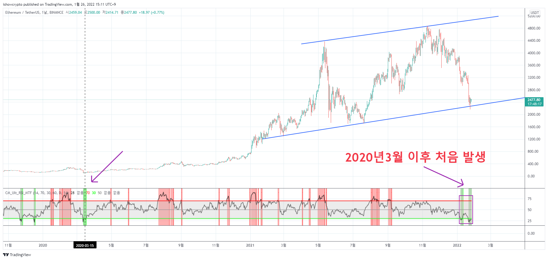 뿐만 아니라 장기 추세의 과매도에서 나타나는 rsi 지표 또한 일봉상 과매도 구간에 접어들었습니다. 이 지표가 연두색 구간에 진입한 것은 2020년3월 팬데믹 쇼크 이후 처음입니다.