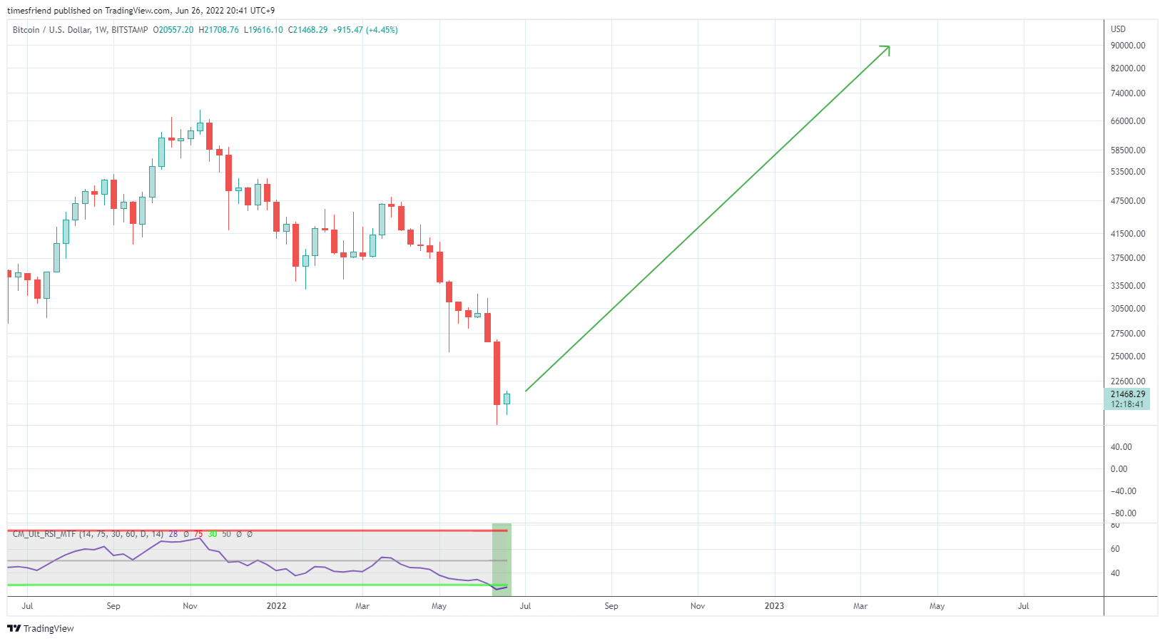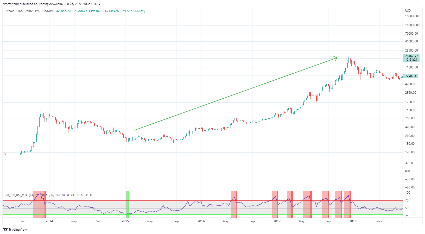 또 하나의 강력한 상승 시그널 중 하나는 비트코인 주봉상 RSI 과매도 구간은 역사적으로 매수의 기회였다는 점입니다. 2015년1월 당시 200달러 구간에서 RSI 과매도(매수시그널)가 발생했고, 이후 3년동안 20,000달러까지 100배 상승합니다.