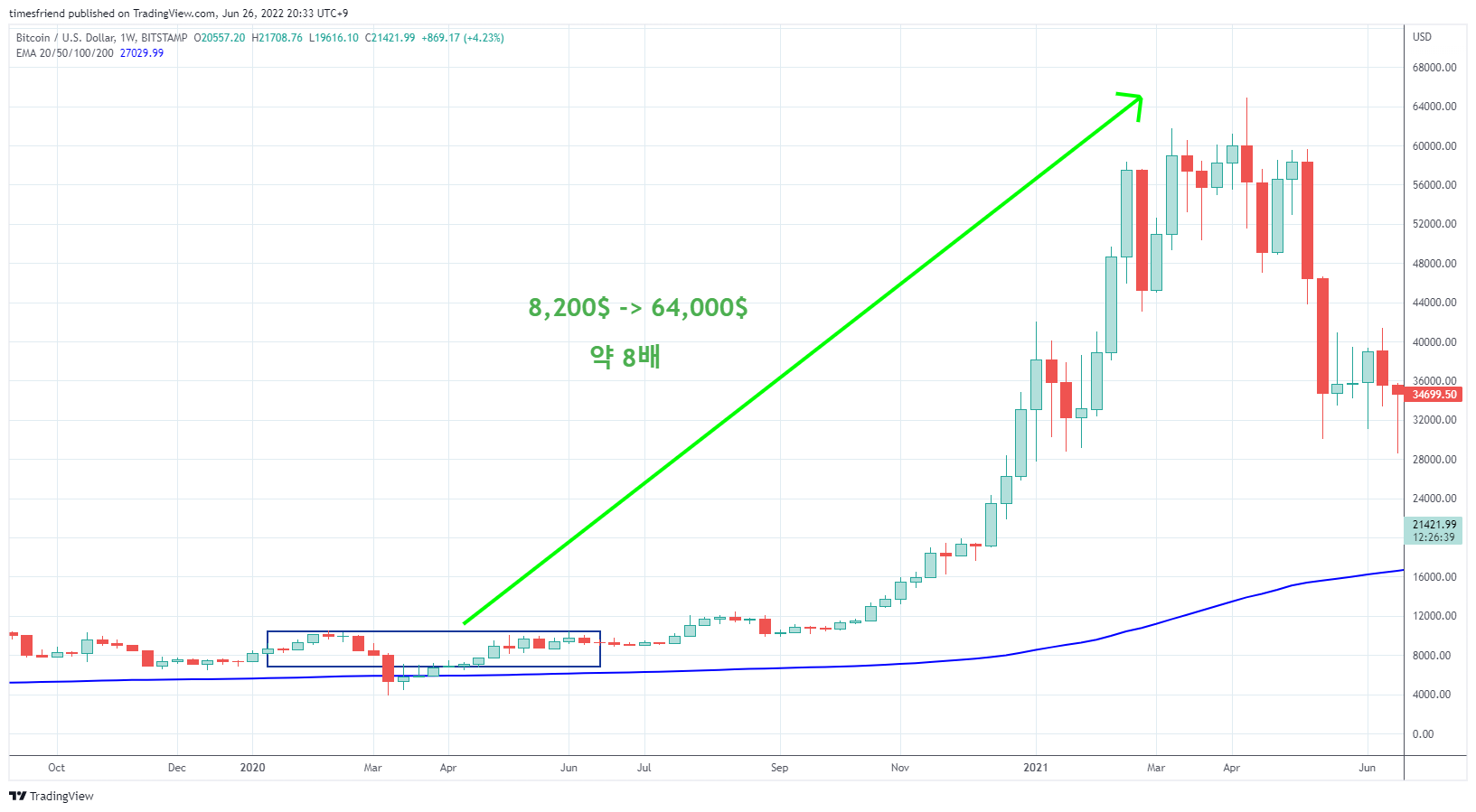 마지막 기회는 코로나 펜데믹이 있었던 2020년3월 이었습니다. 급격한 하락에 시장은 맥없이 무너졌고, 비트코인 가격도 200주 이평선 아래로 내려왔습니다. 그러나 빠르게 회복한 비트코인 가격은 8,200달러에서 신고가를 갱신하며 64,000달러까지 약 8배 상승하는 모습을 보였습니다.