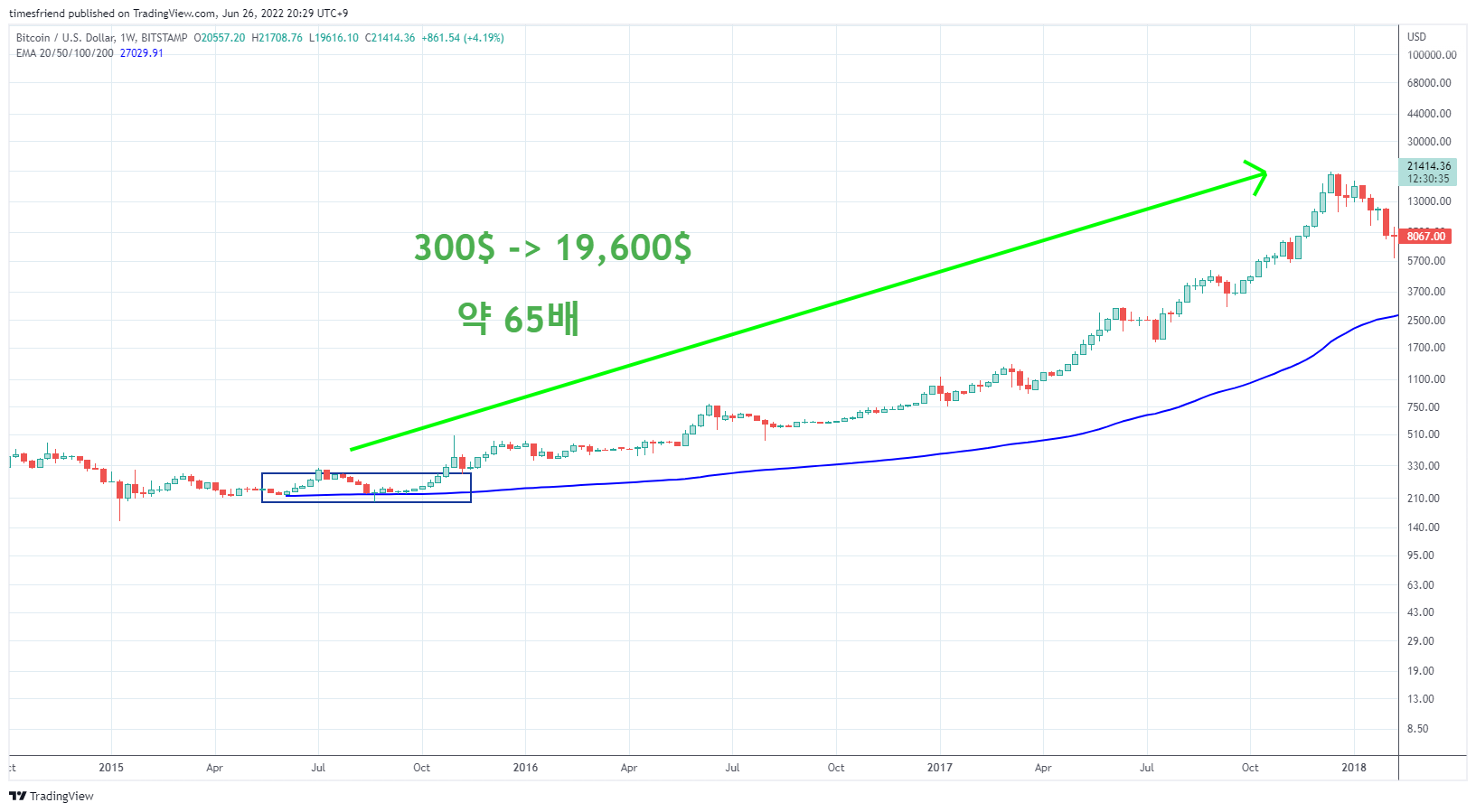 2015년8월 당시 비트코인 가격이 200주 이동평균선 하회했을 때 300달러에 매수했다면, 이후 2017년12월 19,600달러까지 약 65배의 수익을 거둘 수 있는 저가 매수 기회였습니다.