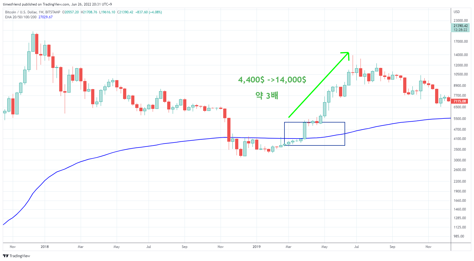 2019년3월 또한 비트코인 200주 이평선 아래 매수 기회가 있었습니다. 이 떄는 4,400달러에서 14,000달러까지 3개월만에 약 3배 상승했습니다.